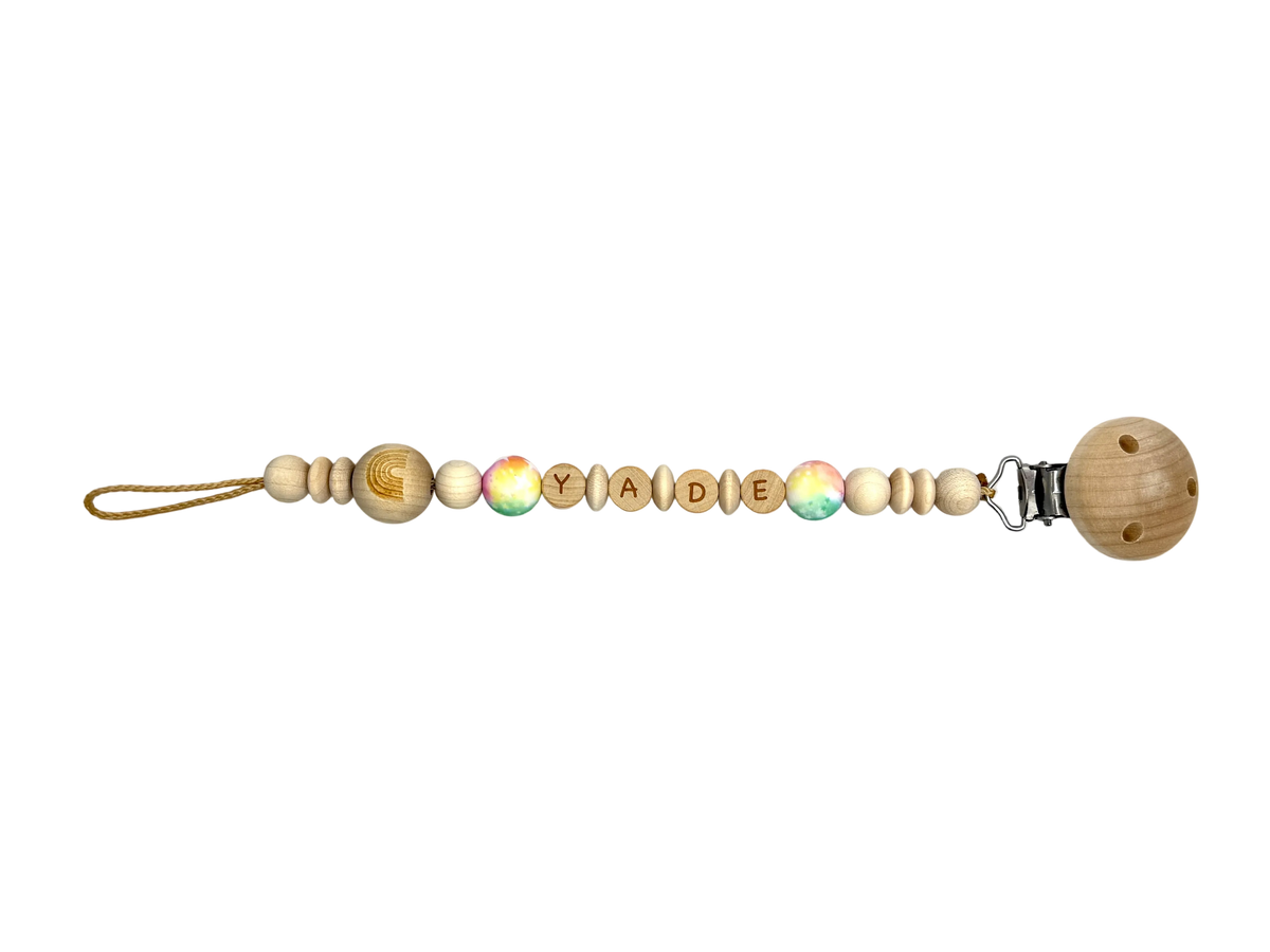 Die Kette besticht durch eine wunderschöne Silikonperle im Regenbogenstil und wird mit dem Namen aus dezenten, hochwertigen Holzbuchstaben personalisiert. Ein praktisches, einzigartiges und schönes Accessoire für kleine Abenteurer